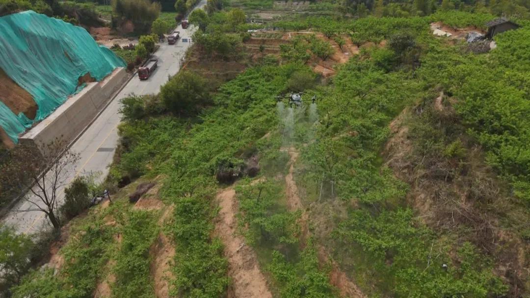 在四堡镇双泉村的果园里,福建省硕谷农林科技公司的技术团队正进行无人机植保作业展示。随着技术员精准操控,无人机在果林上空灵活穿梭,细密药雾如轻纱般均匀覆盖枝头。种植户们纷纷仰头观望,不时举起手机拍摄。