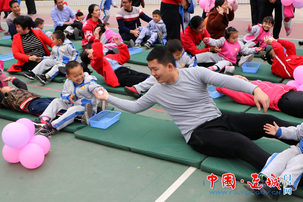 1月1日,连城县城西幼儿园举办“快乐总动员,幸福共成长”为主题家长开放日暨亲子运动会活动,喜迎新年,进一步打造“幸福教育”特色校园文化。通过早操展示、家长拔河比赛、班级亲子游戏等,让幼儿体验运动的快乐,增强家长与孩子之间的情感交流,培育健康活泼的幸福幼儿。图为幼儿和家长一起进行互动游戏。
