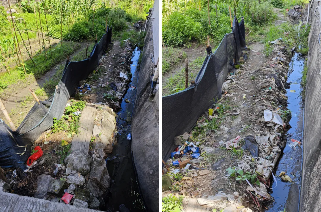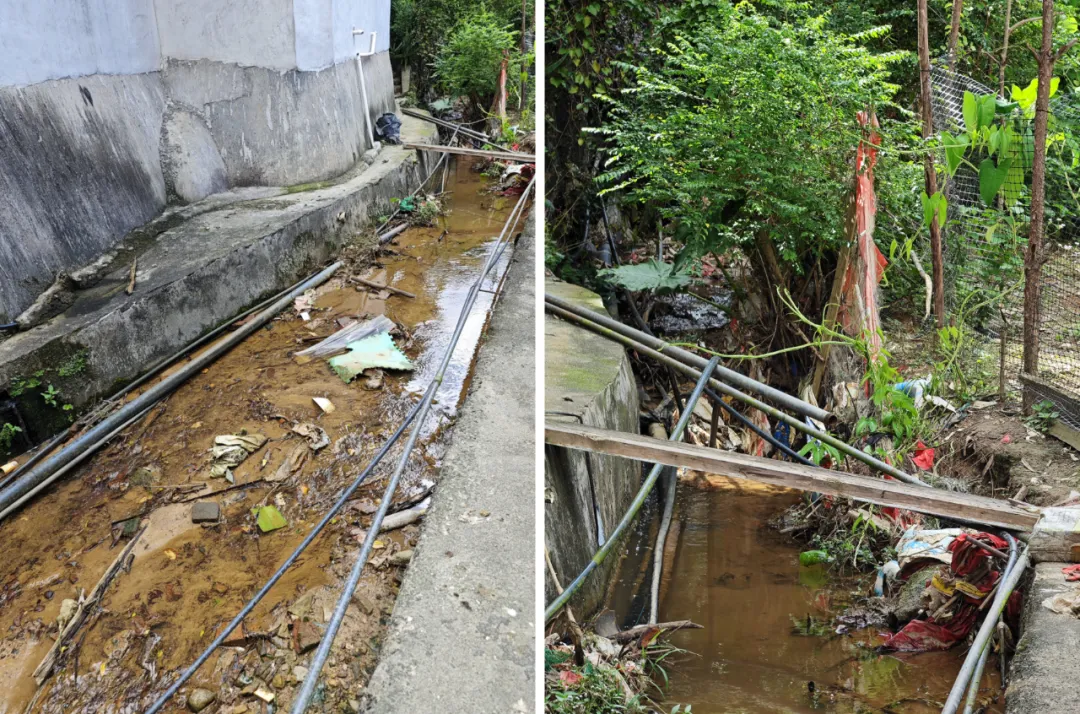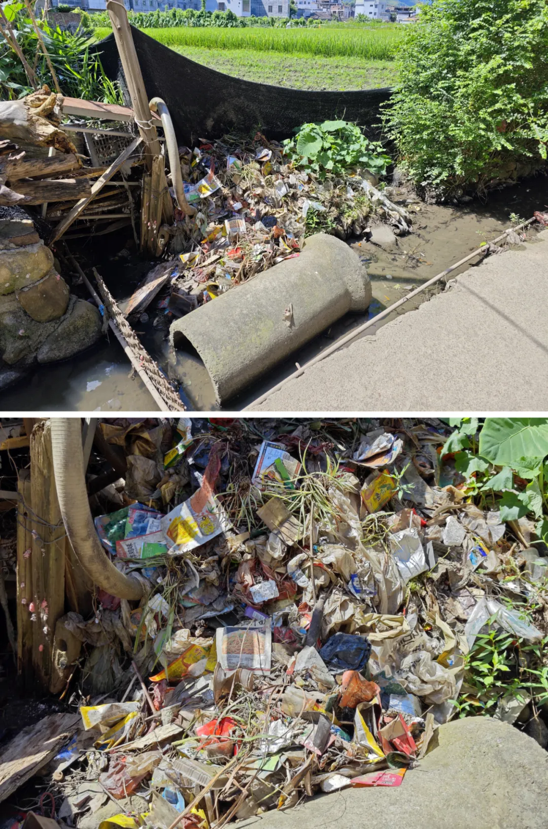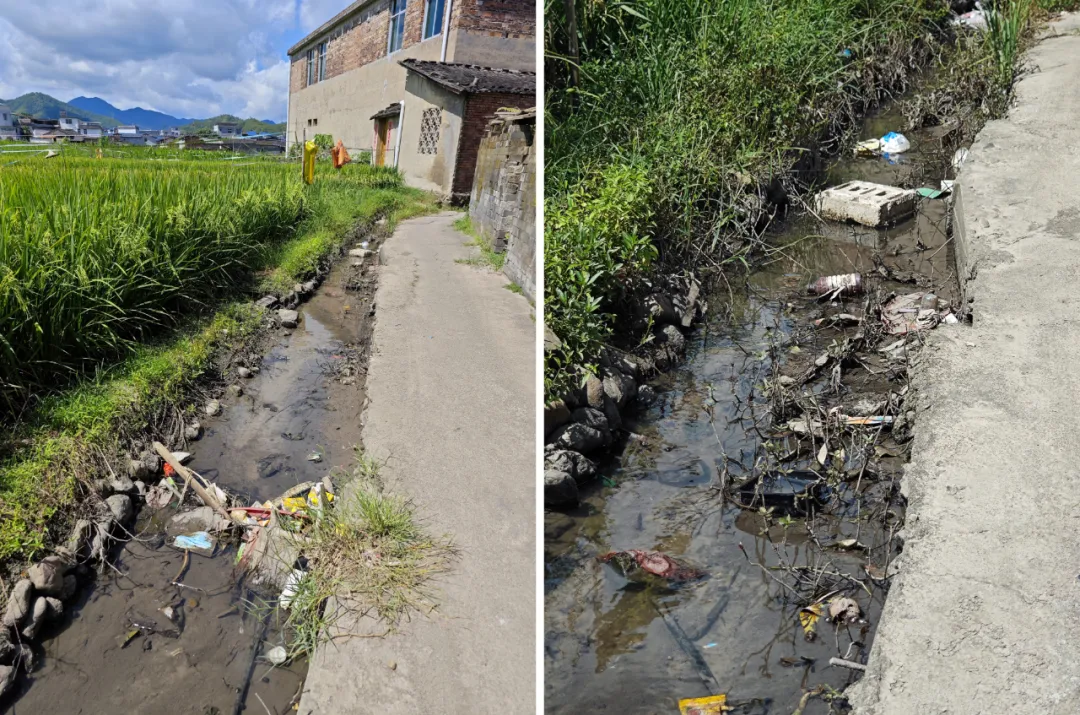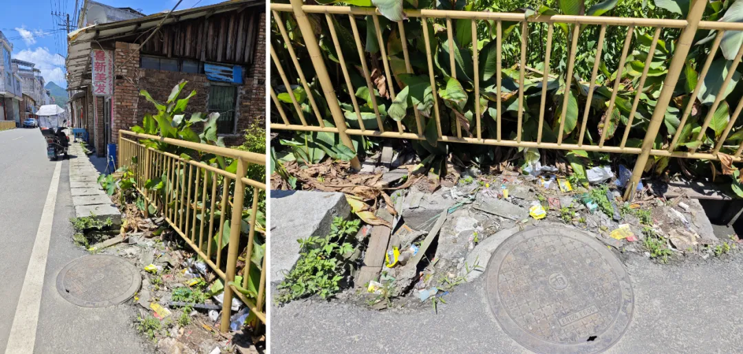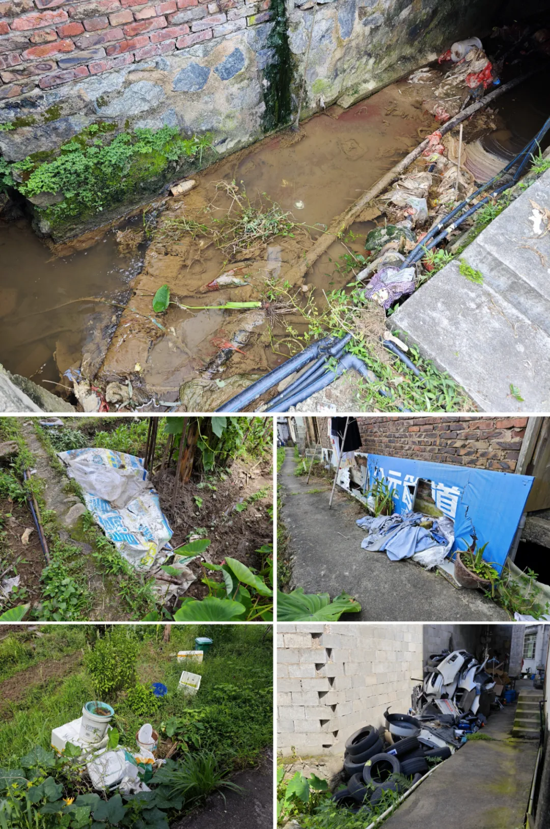 ▲ 水沟内残留生活垃圾未清理;田间地头残留杂物及废弃肥料袋未清理;房前屋后堆放汽修废弃物及其他杂物未清理。