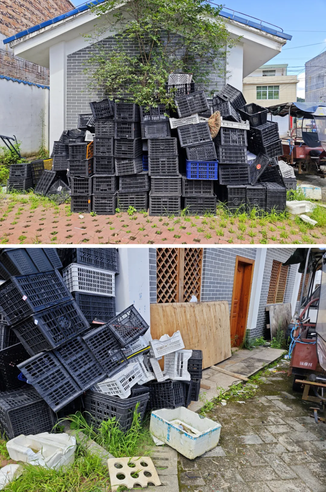 ▲ 房前屋后堆放大量果蔬转运筐及其他杂物未处理。