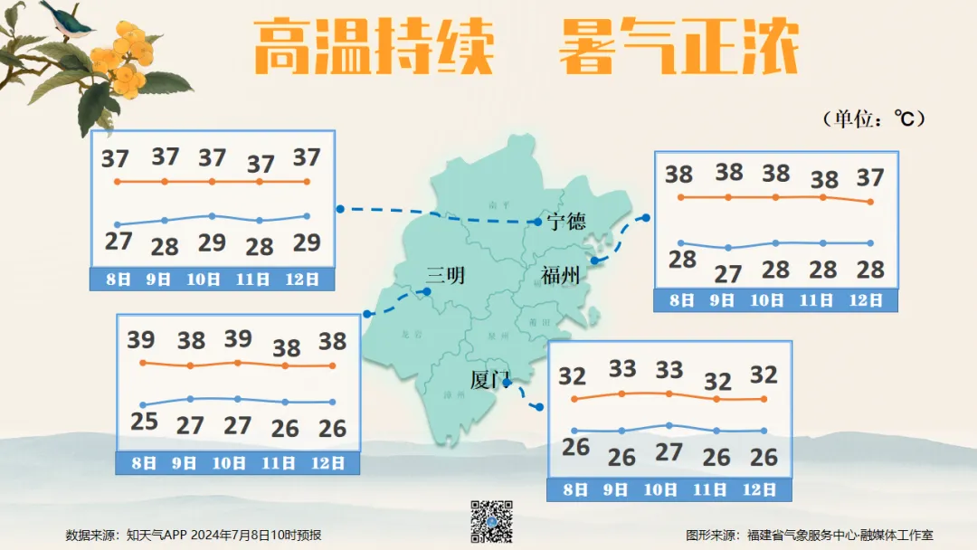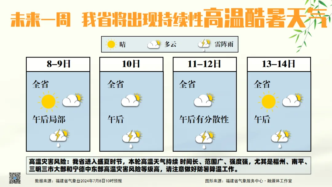 高温灾害风险:我省进入盛夏时节,本轮高温天气持续时间长、范围广、强度强,尤其是福州、南平、三明三市大部和宁德中东部高温灾害风险等级高,请注意做好防暑降温和用火用电安全工作。请相关部门关注持续性高温天气对人体健康、交通安全、电力保供、水资源配置和农业生产等的不利影响,特别是户外或者高温条件下的作业人员应采取必要的防护措施。