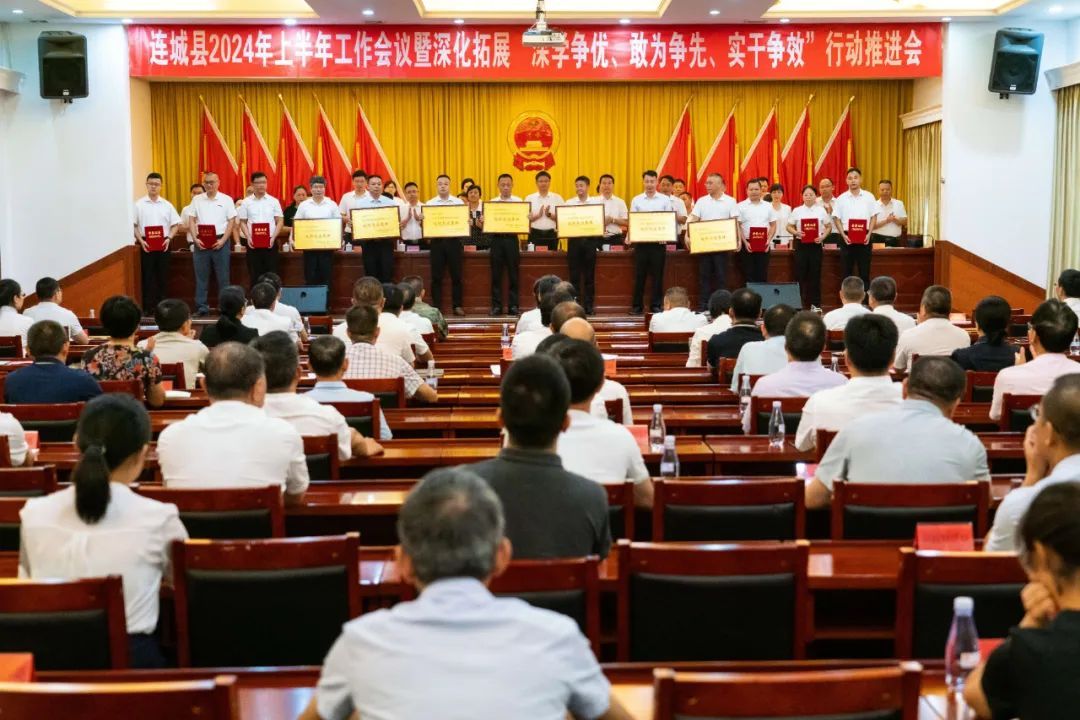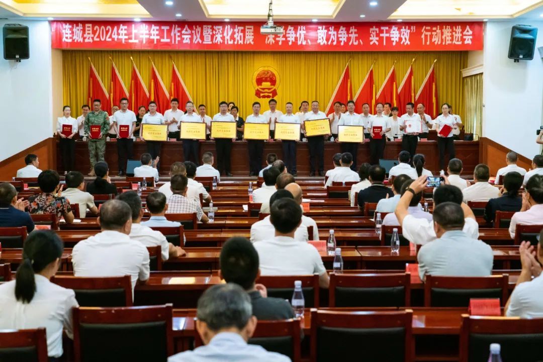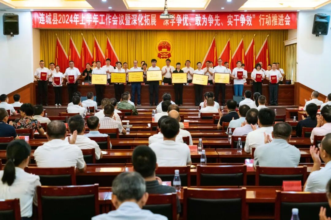 会上,县委副书记罗天进通报连城县2023年度重点项目攻坚、招商引资、“三争”重点工作成绩突出集体和个人,县委常委、常务副县长王秀金通报2024年上半年全县经济运行、全县“五大攻坚行动”进展情况,点评各乡(镇)、连城工业园区上半年经济运行情况;县领导为获2023年度重点项目攻坚、招商引资、“三争”重点工作成绩突出集体和个人代表进行颁奖授牌;县委办公室书面汇报深化拓展“三争”行动开展情况;各乡(镇)和县有关单位书面汇报上半年工作情况及下一步工作计划和建议。