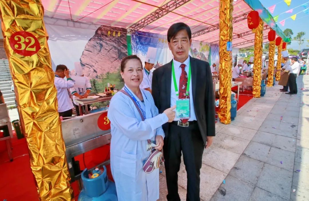在全国海峡客家美食烹饪大赛上,连城县客家美食协会党支部书记王金明与前来参赛的台湾美食协会负责人刘菊英交流