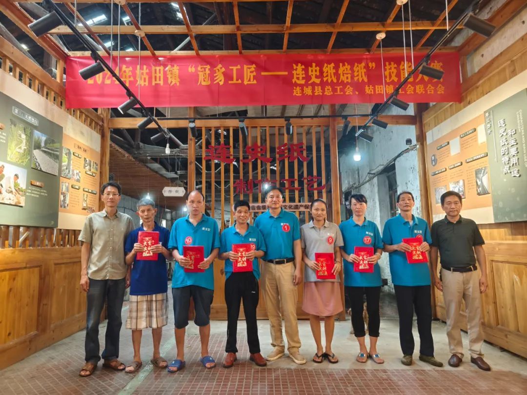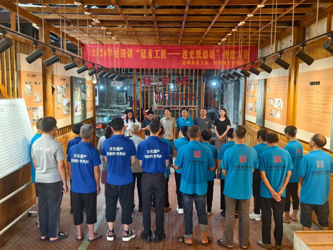 为大力弘扬劳模精神和工匠精神,促进非物质文化遗产的传承和保护,营造尊重知识、尊重劳动、崇尚技能的良好氛围,8月15日上午,连城县总工会、姑田镇工会联合举办的“冠豸工匠”劳动技能大赛活动在连史纸非遗工坊成功举行,20名姑田境内造纸类企业职工及其他手工焙纸爱好者在切磋技艺中展现非遗魅力。