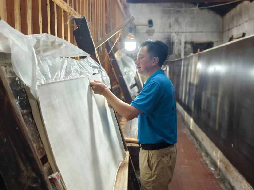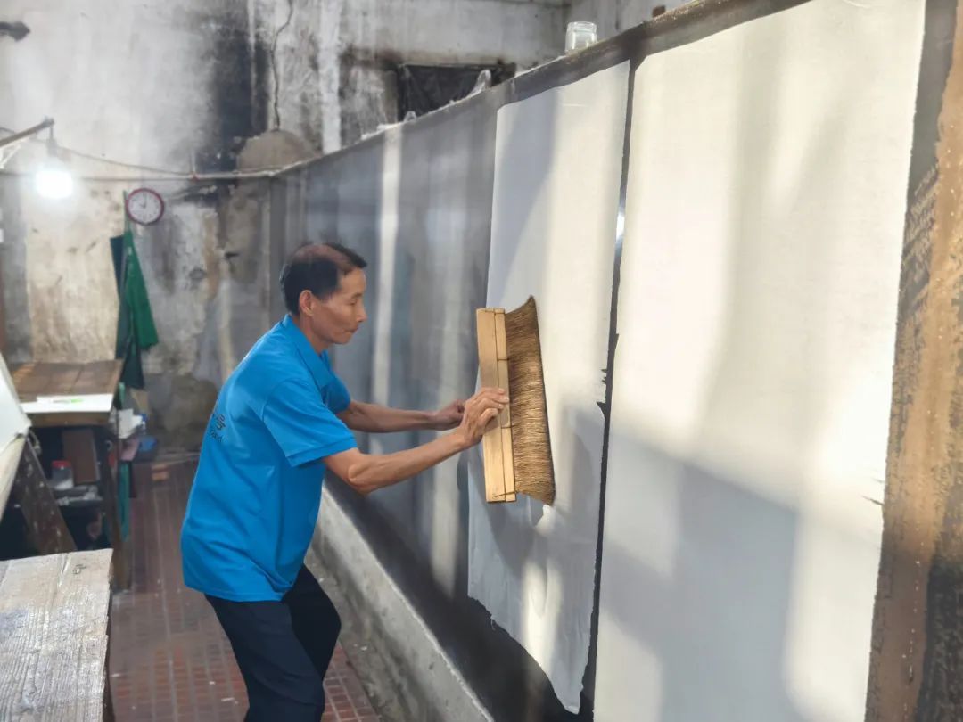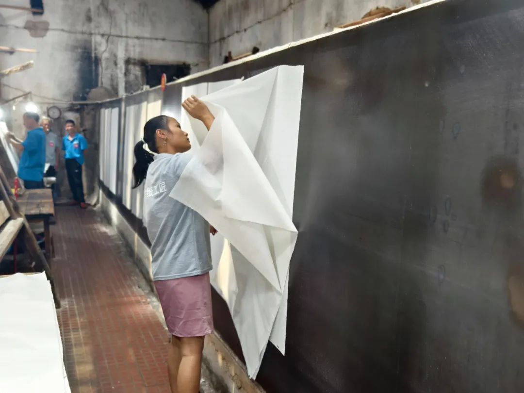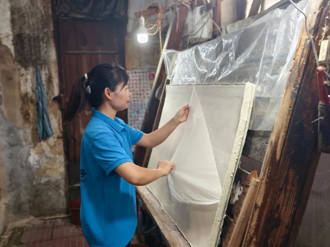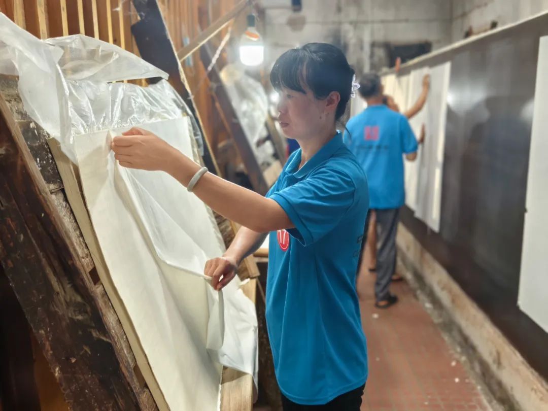 比赛现场,参赛选手们全神贯注,时而小心给纸坯分页,时而上墙焙纸……工匠们埋头忙碌、你追我赶,展现了娴熟的焙纸技术,活动现场气氛热烈、纸香四溢。