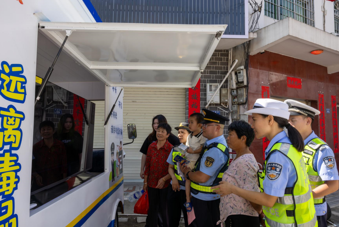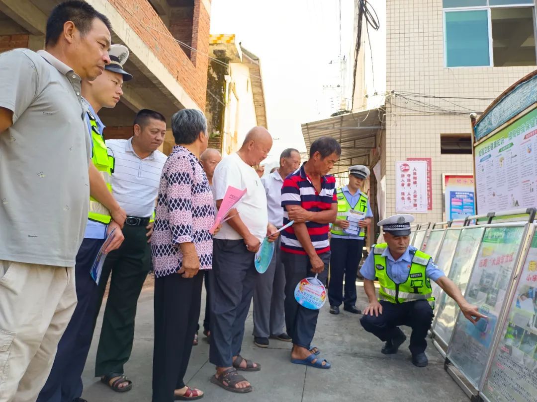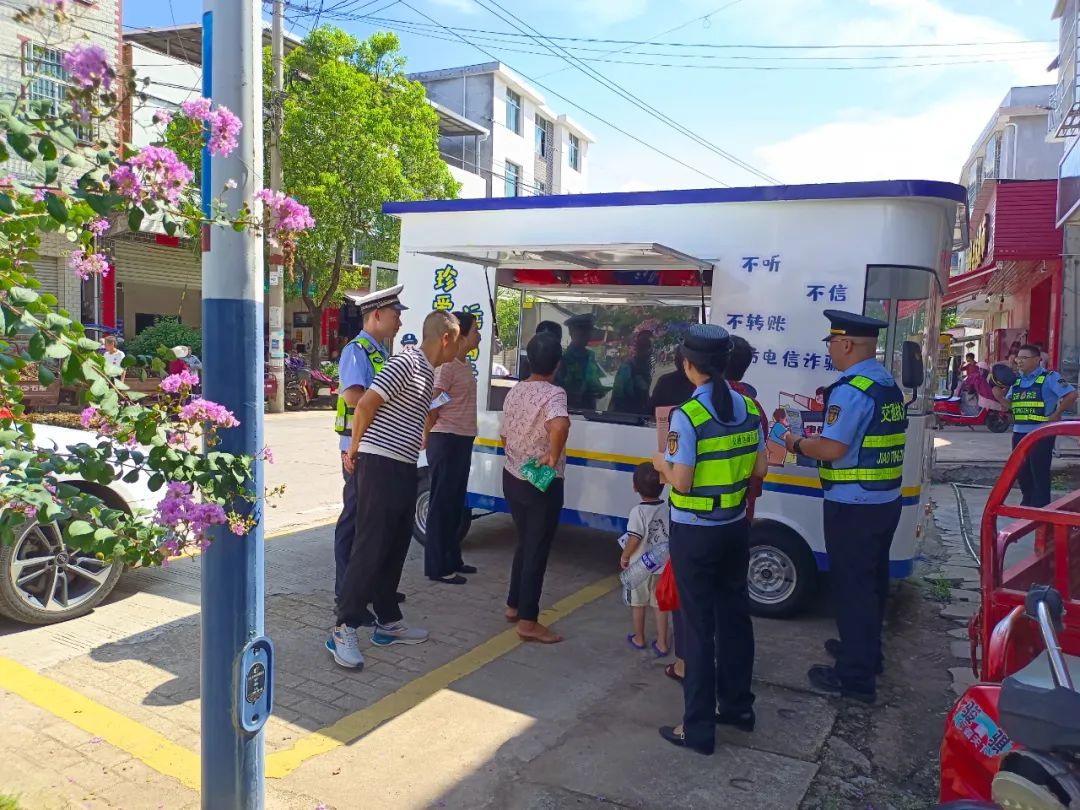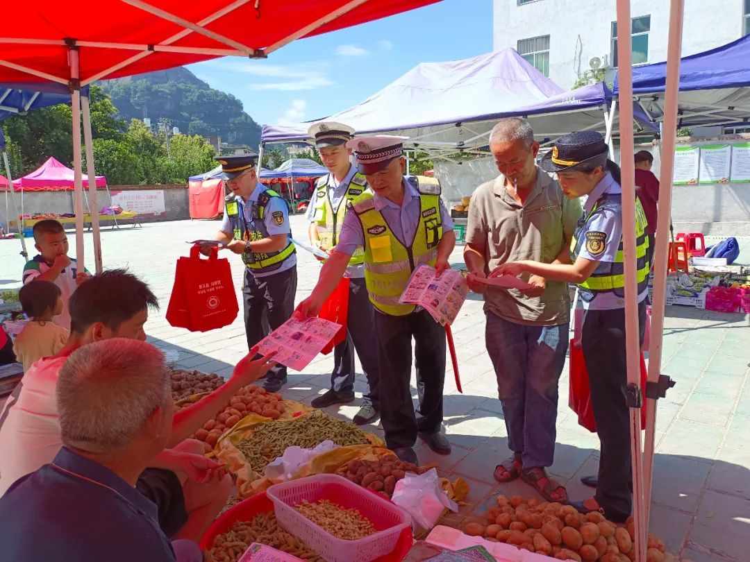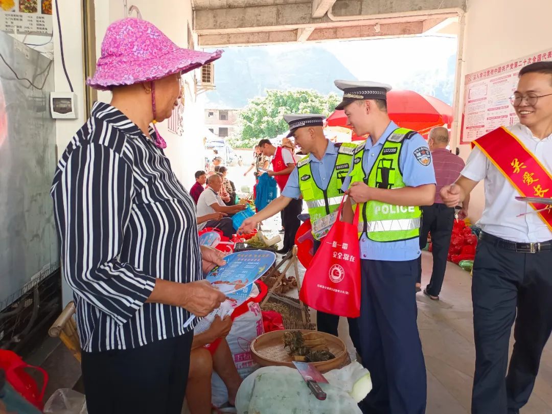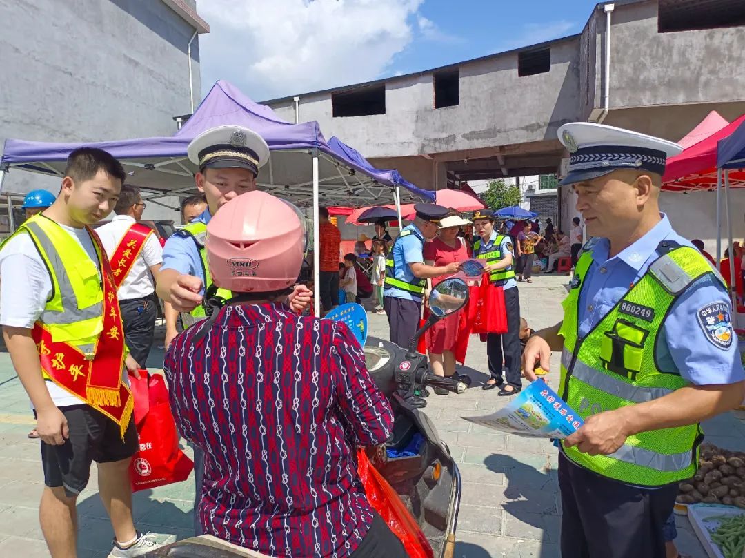 宣传民辅警根据农村道路的实际情况,通过播放交通事故警示视频、摆放事故案例展板、发放宣传资料、印有交通安全知识的购物袋、小礼品等多种形式,进一步扩大交通安全宣传覆盖面,结合“一盔一带”,向摆摊商贩及赶圩群众讲解骑乘摩托车、电动车不戴安全头盔、乘坐汽车不系安全带、农用车、三轮车、老年代步车违法载人、酒驾醉驾、超员超载、无牌无证等农村突出交通违法行为的危害性。