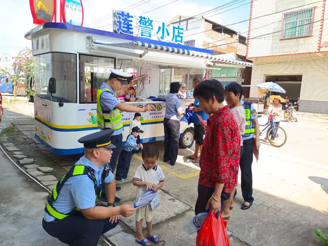 8月14日,连城县公安局交警大队联合县道安办、县交通运输局、龙岩高速执法支队连城中队、揭乐乡人民政府,巧借辖区揭乐乡圩日赶集期间人流、车流集中的特点,利用“莲警小店”开展“美丽乡村行”交通安全巡回宣讲活动。
