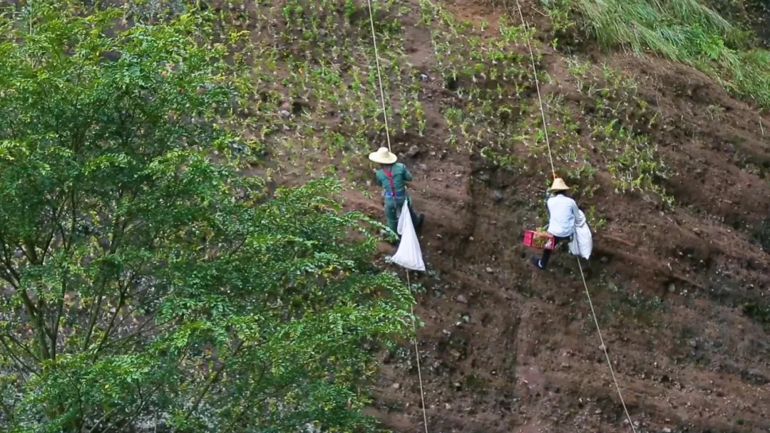近日,在文亨镇福地村老鹰石、田螺神铁皮石斛崖壁种植基地,连城冠江铁皮石斛有限公司负责人江仁辉在安全绳索的保护下,贴着悬崖缓缓下降,精心采摘崖壁上仿野生种植的铁皮石斛。