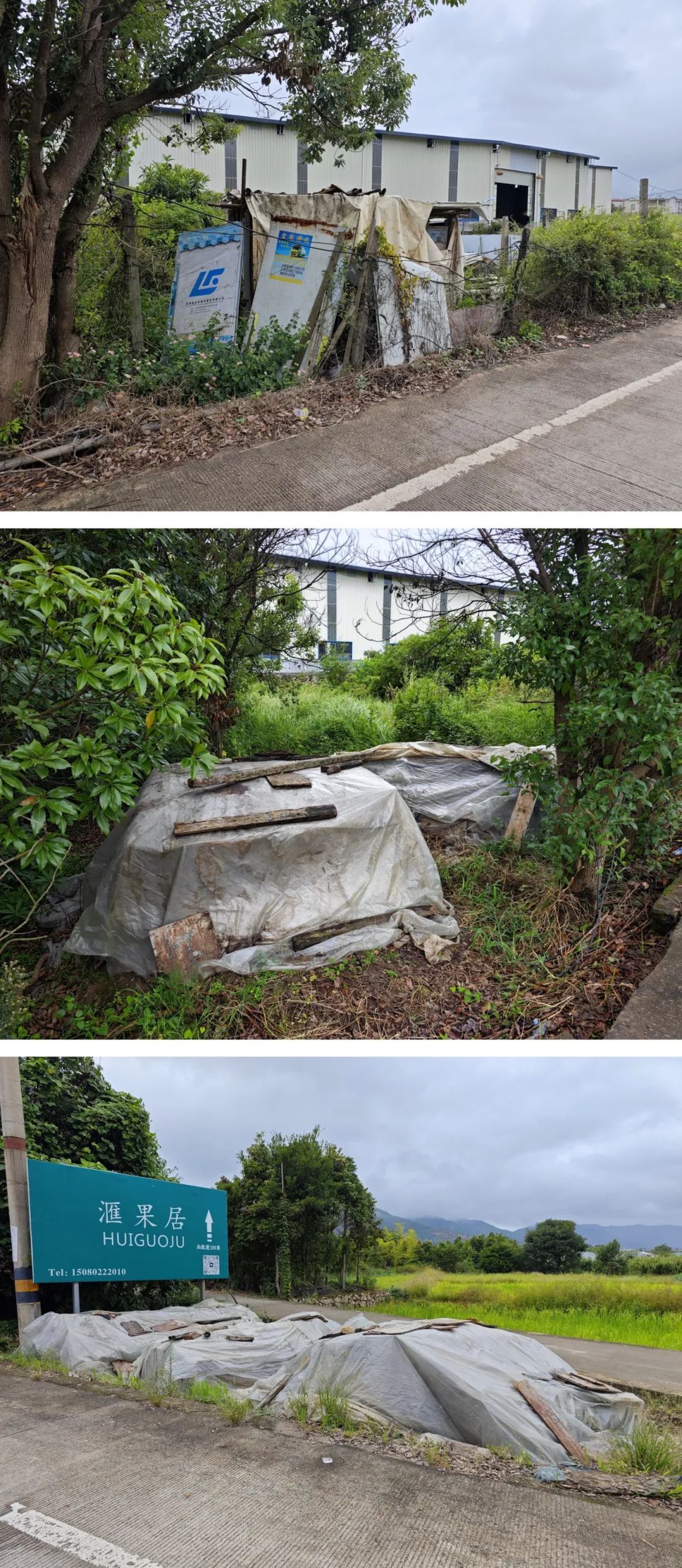 ▲路边随意堆放废旧板材未清理;空地上随意堆放石材未清理