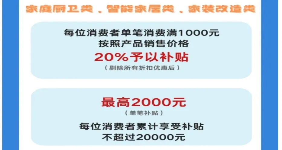 家庭厨卫类/智能家居类/家装改造类·单笔消费满1000元。补贴产品销售价格的20%。单笔消费最高补贴2000元,每位消费者累计享受补贴不超过20000元。
