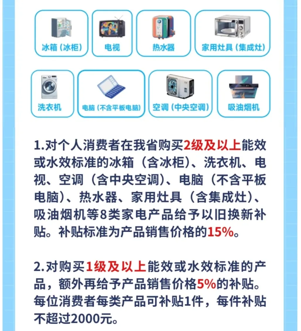 冰箱(含冰柜)、洗衣机、电视、空调(含中央空调)、电脑、热水器、家用灶具(含集成灶)、吸油烟机等8类家电产品。具体参与补贴产品请至活动门店咨询。1.购买2级及以上能效(或水效)标准的产品,补贴产品销售价格(以该商品销售发票含税价格为准,下同)的15%;购买1级及以上能效(或水效)标准的产品,额外再给予产品销售价格5%的补贴。2.每位消费者每类产品可补贴1件,每件补贴不超过2000元。