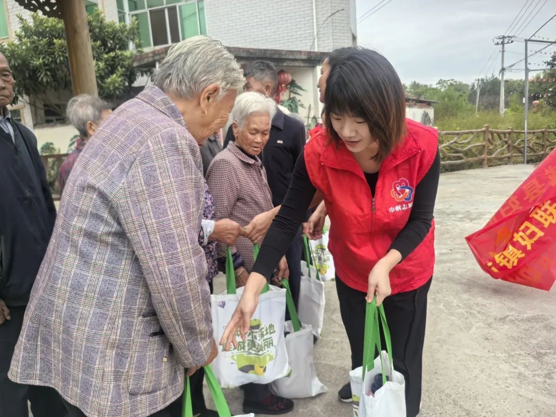 县妇联、林坊镇妇联及陂桥村妇联还为老年人准备蛋糕、水果、洗衣液等节日慰问品,并与他们拉家常,让老人们感受到党和政府的关爱。