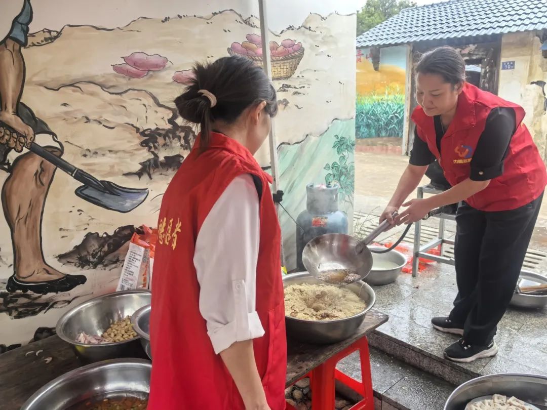 巾帼志愿者为老人们准备爱心午餐,让老人们享受幸福“食”光。