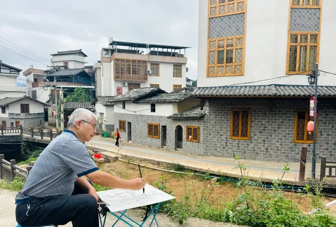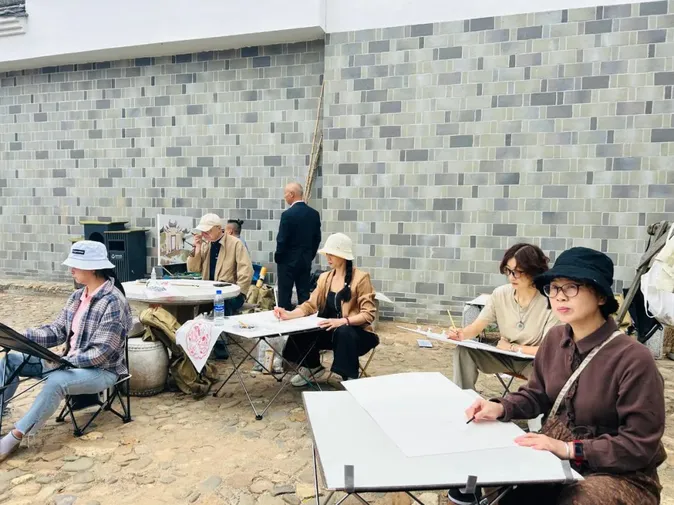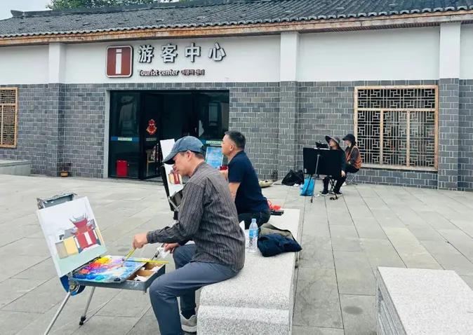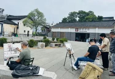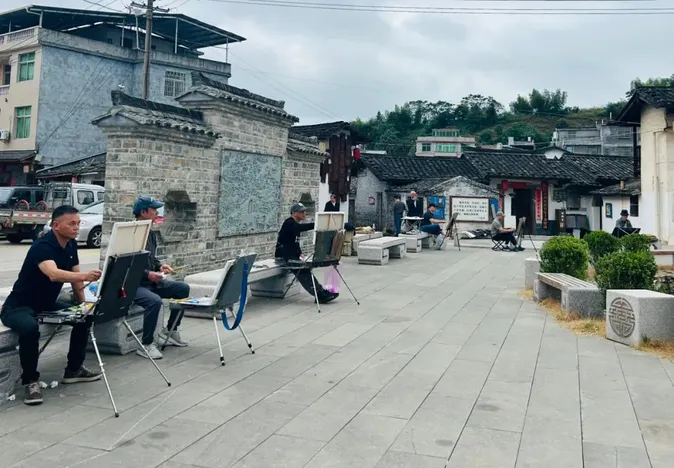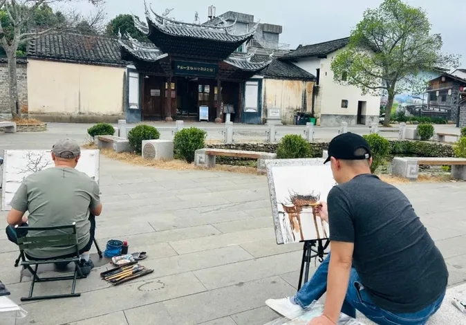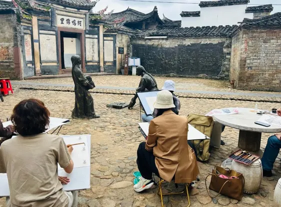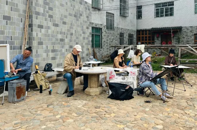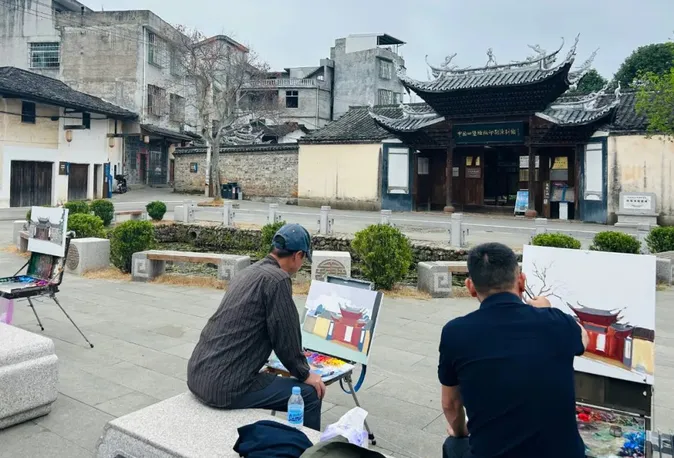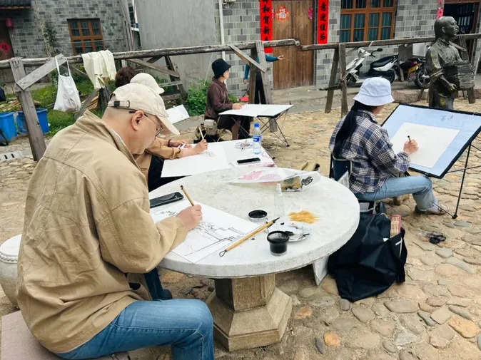 在四堡雕版古镇,画家们穿梭在古建筑中,亲身体验雕版印刷、锡器等非遗技艺。随后,大家沉浸在自己的创作世界中,有的手持细长的画笔,在画布上轻轻勾勒;有的则挥毫泼墨,大胆地使用色彩与线条,展现出一种豪放不羁的艺术风格。