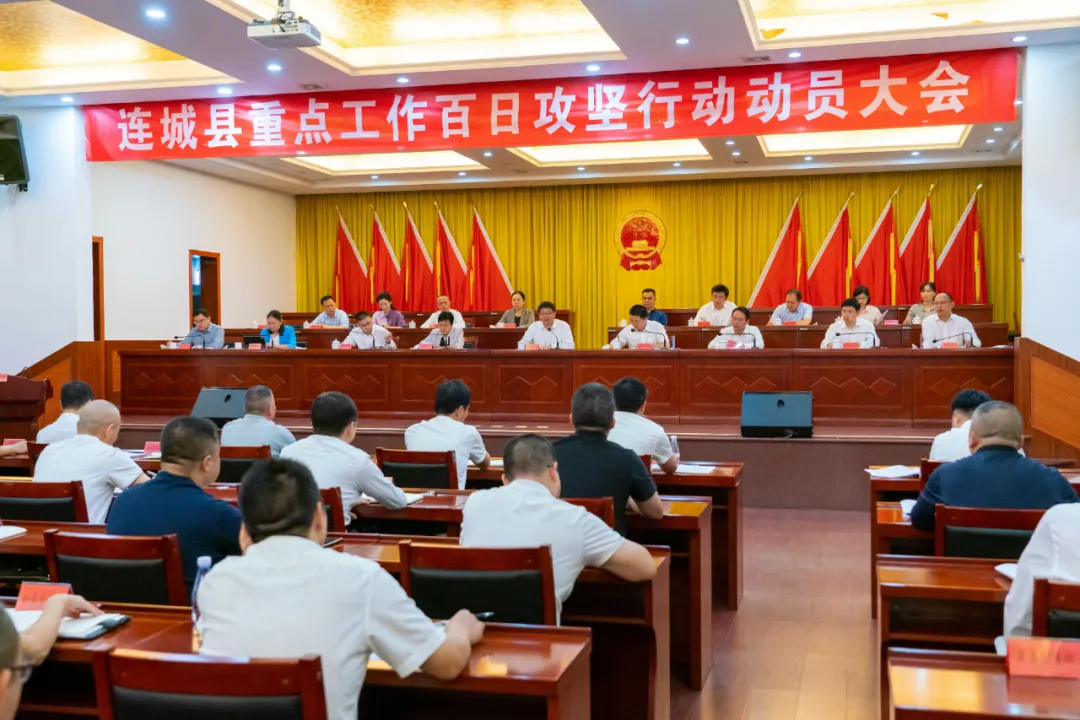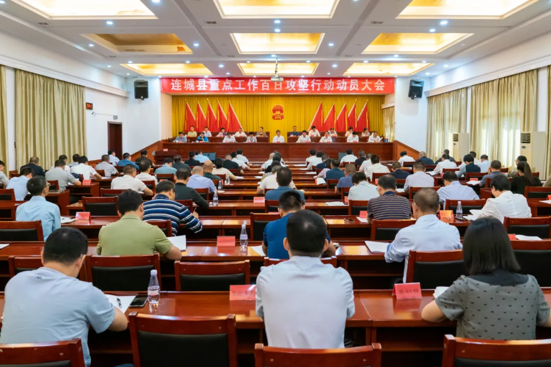 10月14日上午,连城县重点工作百日攻坚行动动员大会召开,对全年重点工作进行再梳理、再动员、再部署,推动完成全年经济社会发展目标任务。县委书记蔡东阳出席会议并讲话,县委副书记、县长赖育忠作工作部署。赖小香、陈荣斌、罗天进、廖文才、王秀金、李镇祥、张开等县领导,县法院代院长、县检察院检察长,冠豸山风景区管委会党委书记、主任,县直有关单位(含垂管部门)主要负责人,各乡(镇)党政主要负责同志等参加会议。