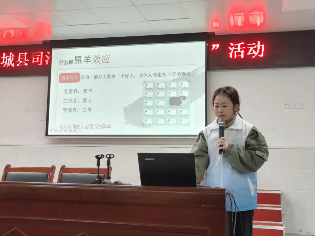 课堂上,“蒲公英·红土法豸”普法志愿者童伊煊充分发挥自身心理学专业优势,紧密贴合未成年人成长特点和心理需求,将法治教育与心理健康知识相融合,生动地讲解了预防校园欺凌方面知识。同时,结合真实案例剖析,呼吁同学们不当欺凌者和被欺凌者,不当沉默者和旁观者,勇敢向欺凌行为说“不”。