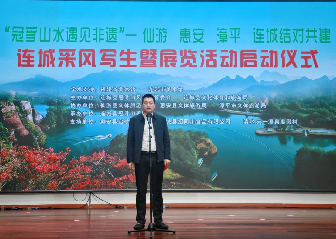 3月11日上午,“冠豸山水遇见非遗”——仙游、惠安、漳平、连城结对共建连城采风写生暨展览活动在连城县四角井历史文化街区梨园启动。省美术馆副馆长方一珊,县委常委、宣传部部长陈聚水,县文联、县文体旅游局、清水·天一温泉度假村等主要负责人,画家代表、书画爱好者等参加活动。
