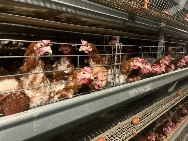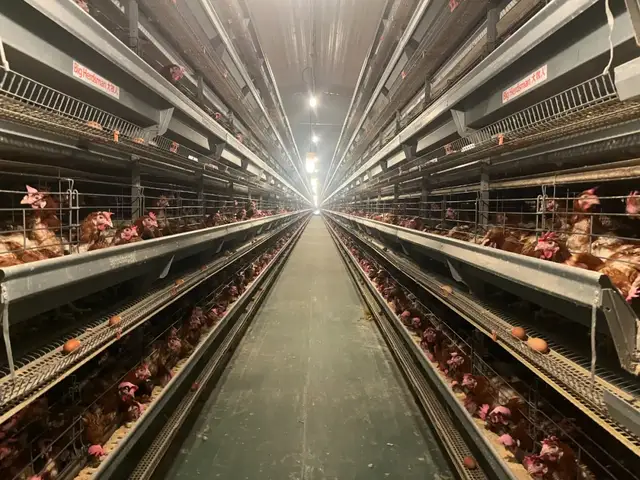 走进二期项目1号蛋鸡养殖厂房内,现代化蛋鸡“智能宿舍”映入眼帘,一排排标准化养殖笼架排列有序,自动化饲喂系统精准地把鸡饲料投放到料槽内,10万羽蛋鸡争相进食。