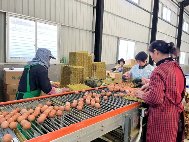 3月17日下午,记者在福建省创亿元农牧有限公司蛋品加工车间看到,一枚枚新鲜鸡蛋通过传送带被运送至拣蛋平台,工人们有条不紊地分拣、装托、打包新鲜合格的鸡蛋,另一部分工人正忙着将一箱箱鸡蛋装车。