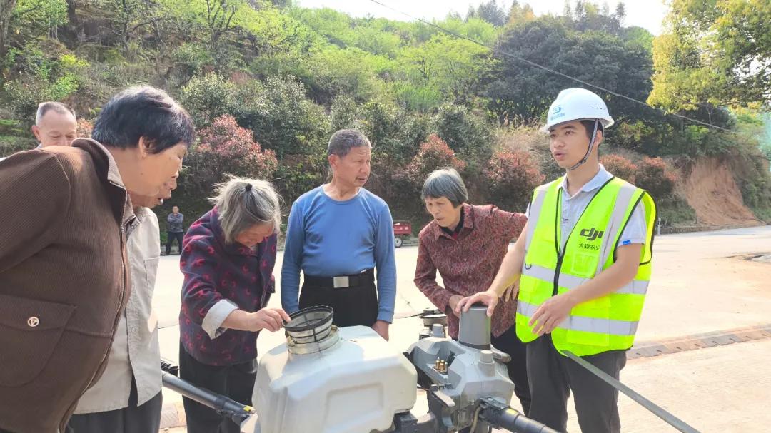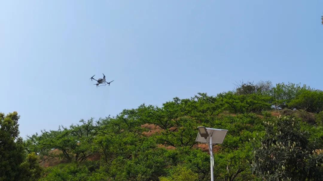 在四堡镇双泉村的果园里,福建省硕谷农林科技公司的技术团队正进行无人机植保作业展示。随着技术员精准操控,无人机在果林上空灵活穿梭,细密药雾如轻纱般均匀覆盖枝头。种植户们纷纷仰头观望,不时举起手机拍摄。