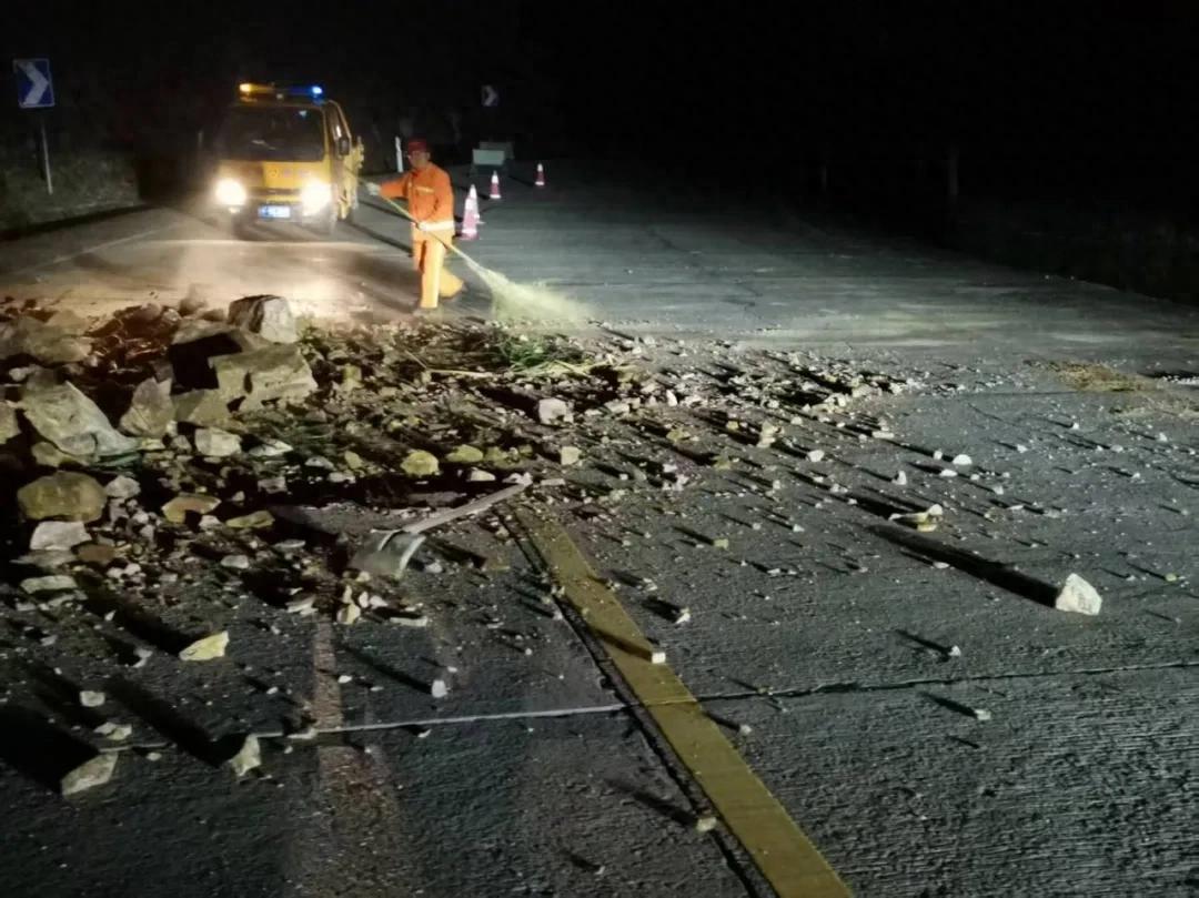 4月12日23时42分,接县12345平台的险情通报:205国道姑田镇鸭公腰路段公路上有溜方,溜方体的石头铺满路面2/3的路面,影响车辆畅通。险情即命令。连城公路中心李屋公路站值班人员当即带上清理工具奔赴现场。到达现场后,公路养护人员按三级警示对作业区进行安全布控,有序展开清理作业:有的用磅锤将大石头解小、有的挥动着铁锹将石头装上车、有的挥舞着大扫把清扫路面的碎石、有的徒手搬石头、有的引导车辆安全通行。经过近两小时紧张有序的分工、协作,于13日凌晨2时0分,恢复了该路段的安全畅通。就在这时,新的险情通报又到:205国道李屋路段有倒伏的树木横亘在路面上。公路养护人员来不及喘口气,立即奔赴下一个险情现场……