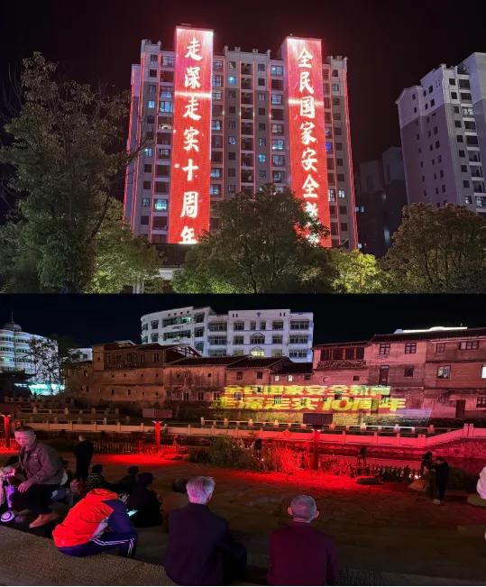 在街头巷尾,党员干部结合在职党员进社区、主题党日活动,开展国家安全普法宣传,将维护国家安全的因子传递到每一个角落;在连城四角井历史文化街区、时代广场等景区、商场,LED墙幕滚动播放国家安全宣传标语和宣传短片,震撼的画面和生动的讲解吸引了不少过往群众驻足观看;在连城客家文化公园,非遗技艺与国家安全精彩碰撞,木偶艺术家用精湛的技艺操纵木偶蘸墨挥毫,书写“国家安全,人人有责”等宣传标语,引得现场群众阵阵喝彩。