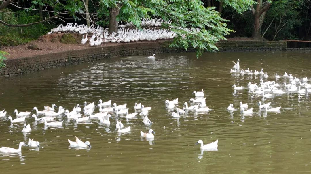吴小花已有十余年养殖白鸭经验,几年前,她看中了生态循环养殖的前景,流转120亩土地,把养殖转变生态循环养殖。在鸭舍下游自建200平方米池塘进行污水净化,同时养殖小鱼,池塘作为白鸭活动区域,小鱼作为白鸭的饲养食物循环利用。同时,在基地内种植芙蓉李、水蜜桃等果树,鸭子在果园里活动,不仅可以除草,还可以减少化肥用量,用鸭粪培育蚯蚓再反哺鸭子,达到降本增效的作用。