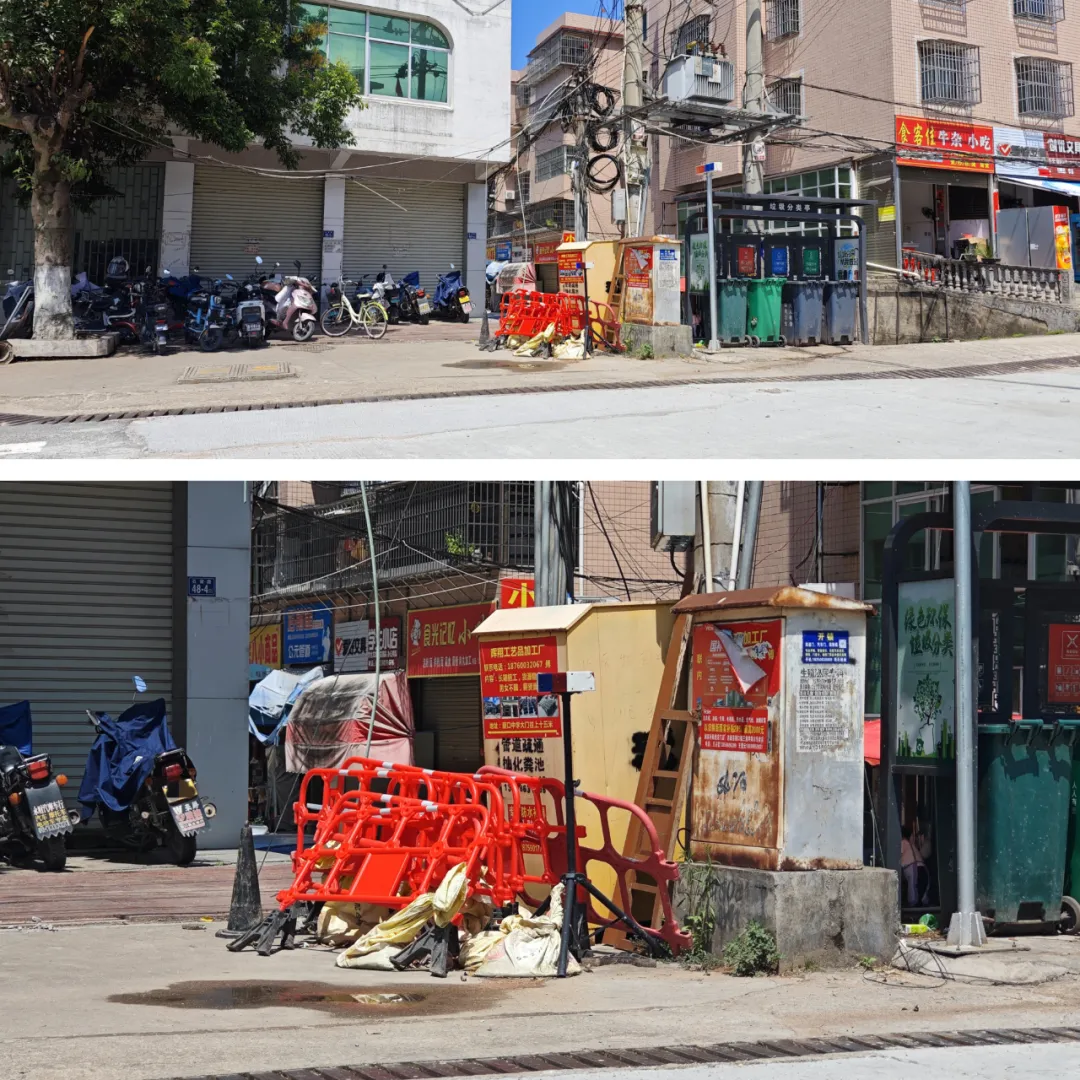 ▲路边垃圾分类亭旁乱堆乱放施工路障未清理
