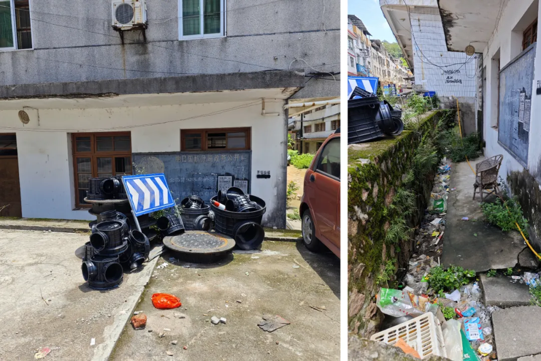 ▲路边乱堆乱放施工材料未清理;底部排水渠内残留较多垃圾未清理