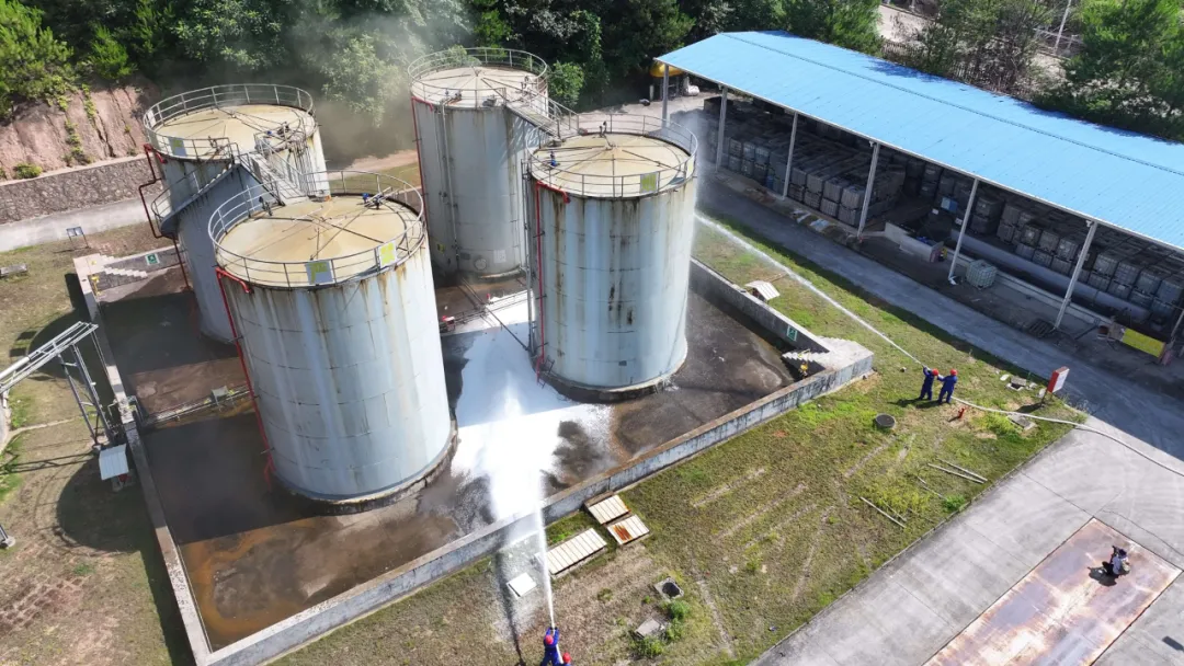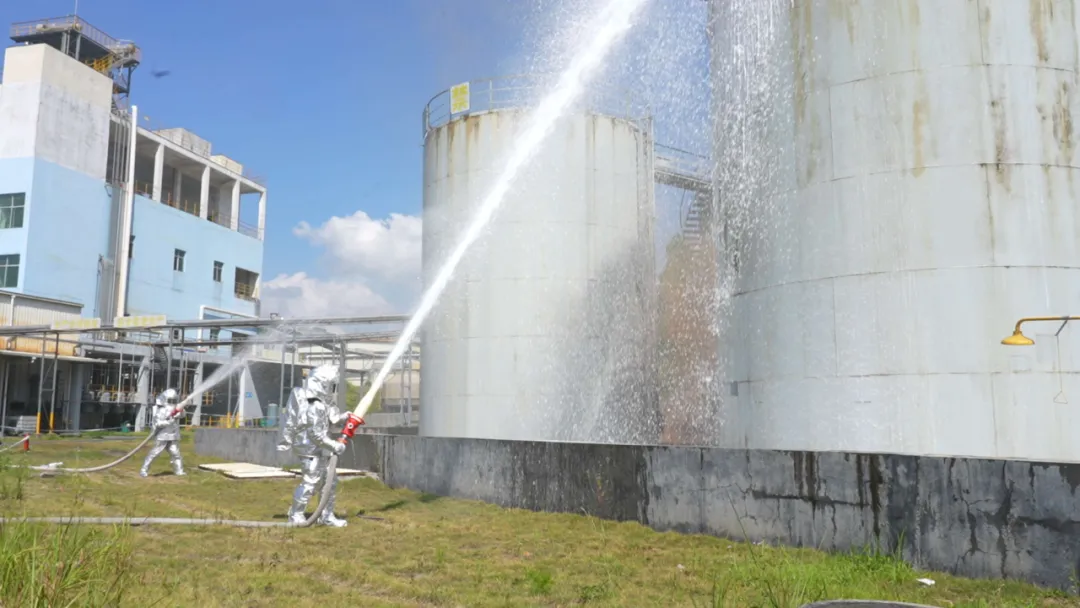 演练模拟福建鸿和生物科技股份有限公司在检查地下储罐和罐区的管道法兰时发现1#罐出料法兰螺栓松动,导致重质松节油喷溅,维修人员维修过程中使用的铁质扳手产生静电火花,引燃泄漏重质松节油,造成火灾。