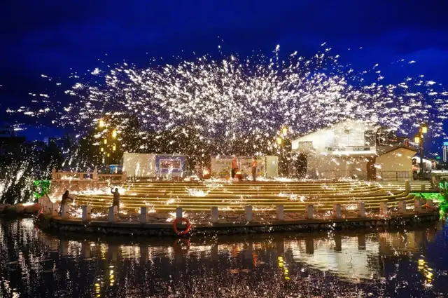 白天的山水之约尚未落幕,夜晚的文化盛宴已悄然登场。四角井历史文化街区,水幕秀与墙幕秀交相辉映,千年非遗“打铁花”在夜空绽放金色火花——老街区化身夜游胜地,非遗表演、客家美食、市井烟火在此交融。