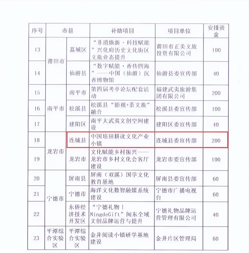 其中连城县宣和镇中国培田耕读文化产业小镇项目补助资金200万元