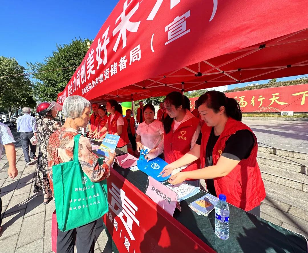 10月17日上午,连城县2025年世界粮食日暨全国粮食安全宣传周主会场活动在街心公园举行。县粮储局、农业农村局、教育局、工信科技局、团县委、妇联六部门联合设立咨询台、展板区和互动体验区,向市民发放《粮食节约 人人有责》宣传册,现场解答节粮减损、科学储粮、健康膳食等问题。