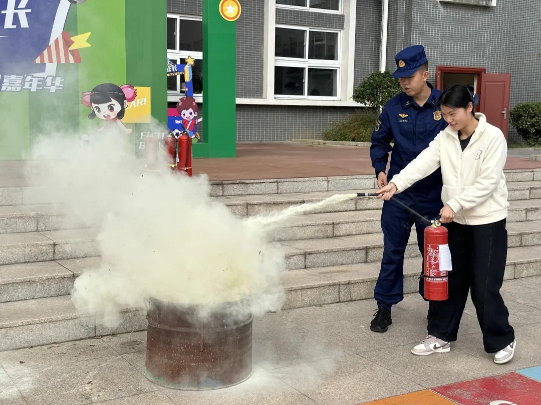 演练现场,消防救援人员还开展了灭火器实操演示教学,手把手指导师生掌握灭火技巧。