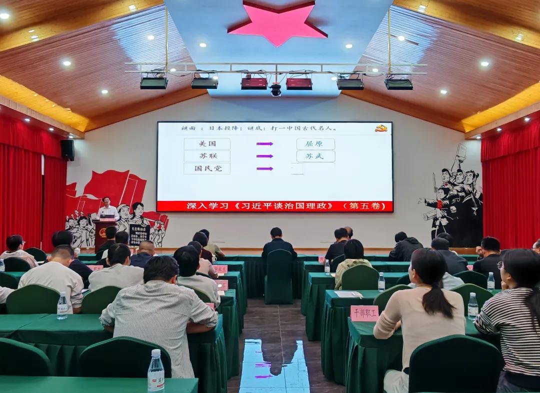 这次活动是“文明有象”讲坛首讲,邀请县委党校俞文斌老师为大家讲述了《习近平谈治国理政》第五卷学习辅导讲座。讲座从《习近平谈治国理政》第五卷的历史维度与理论贡献、逻辑体系与核心要义、实践要求与行动自觉三个方面进行系统全面的解读。整场讲解深入浅出,听众全神贯注。大家在对理论的深入阐释与生动解读中,深刻感悟到著作中蕴含的真理力量与实践伟力,进一步筑牢了思想根基,激发了将学习成果转化为实际行动的自觉与担当。