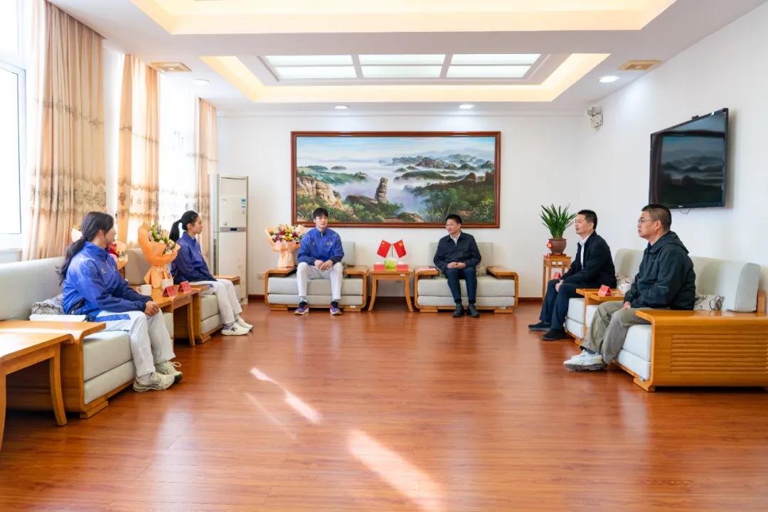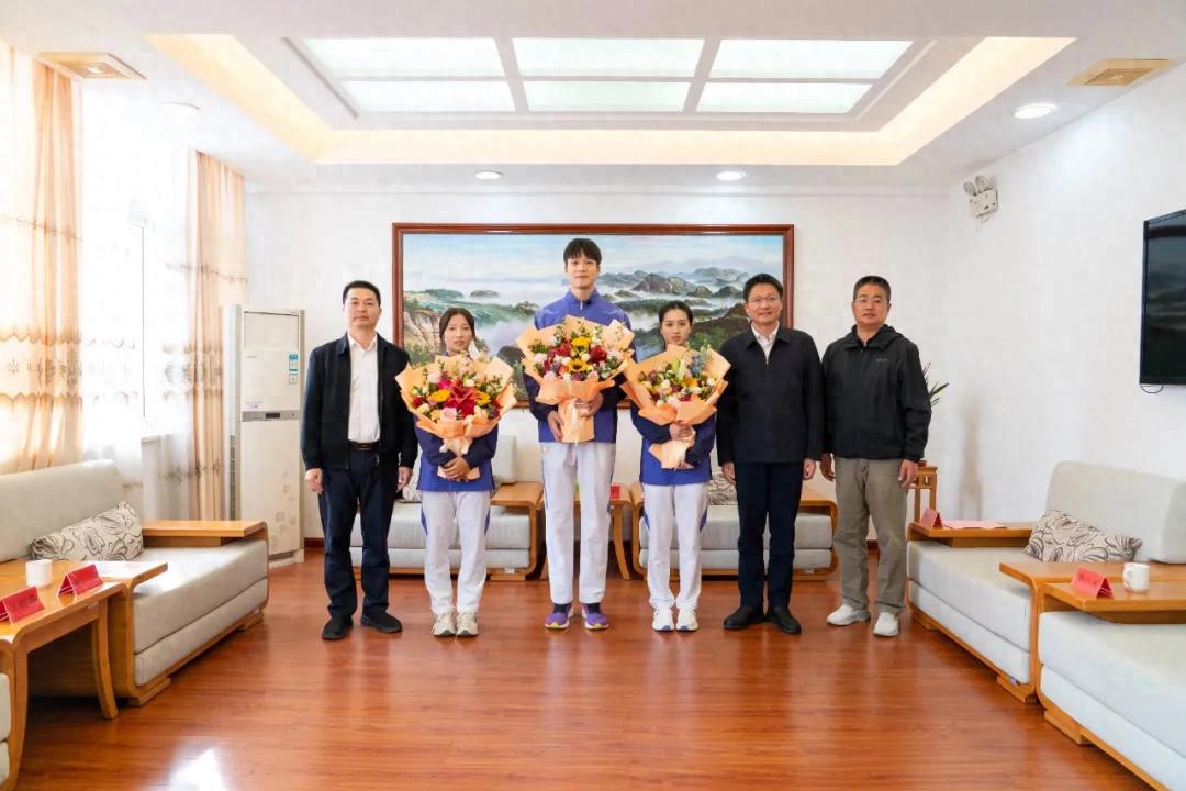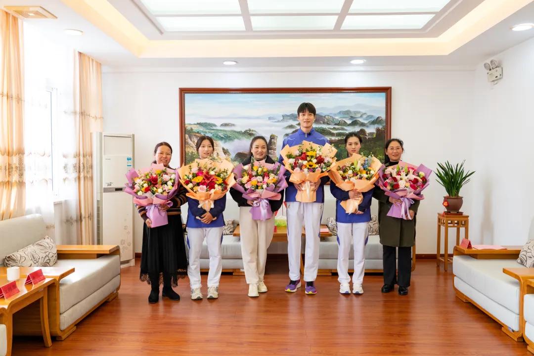 蔡东阳、赖育忠、李川龙为运动员们送上鲜花,现场气氛温馨而热烈。蔡东阳代表县四套班子和全县人民,对他们在全运会赛场上取得的优异成绩表示热烈祝贺,对他们不畏强手、奋勇拼搏的精神致以崇高敬意。希望他们以在全运会上取得的优异成绩为新起点,再接再厉、再创佳绩、再立新功,并要求相关部门切实做好服务保障工作,主动了解运动员需求,及时帮助解决实际困难,全力为运动员安心训练、勇创佳绩创造良好条件。