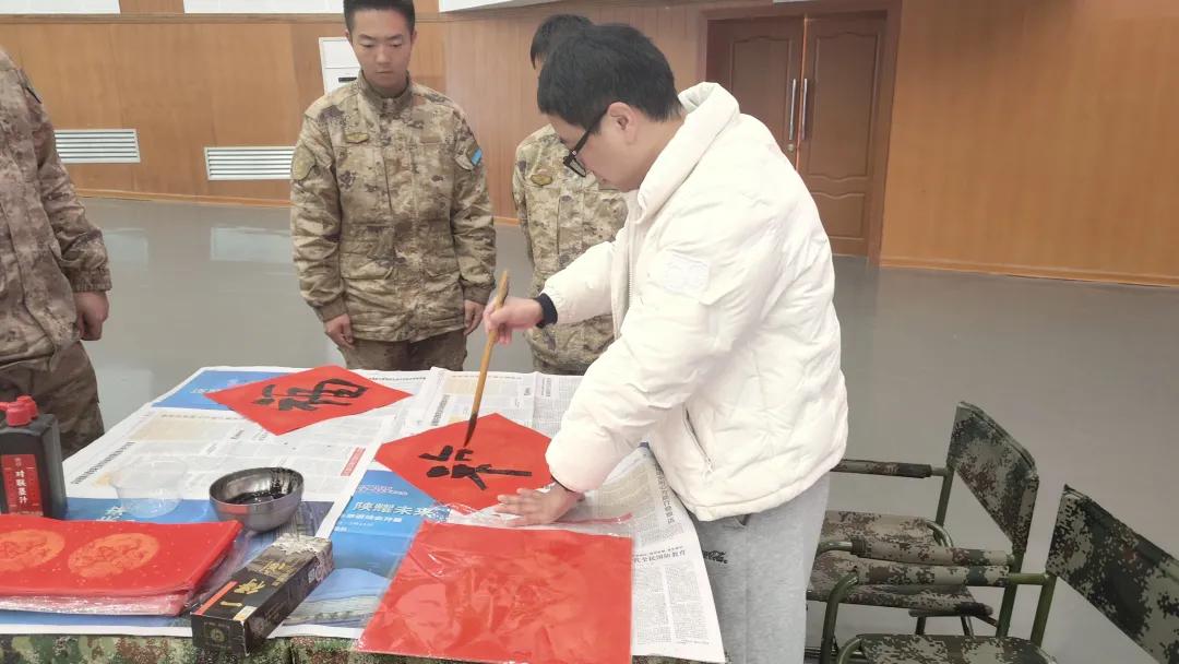 活动现场墨香四溢、暖意融融,书法家们凝神聚力、笔走龙蛇,楷书端庄大气、行书飘逸流畅、隶书古朴厚重,一幅幅寓意吉祥、饱含敬意的春联,一个个苍劲有力、暖意融融的“福”字跃然纸上。每一副春联都寄托着对强军事业的美好期许,每一个“福”字都承载着地方人民对官兵的诚挚关怀;官兵们踊跃挑选、驻足品鉴,不时请书法家题写专属祝福,手捧墨迹未干的作品,脸上洋溢着幸福的笑容,纷纷表示将把这份温情关怀,转化为练兵备战、守护家国的强大动力。
