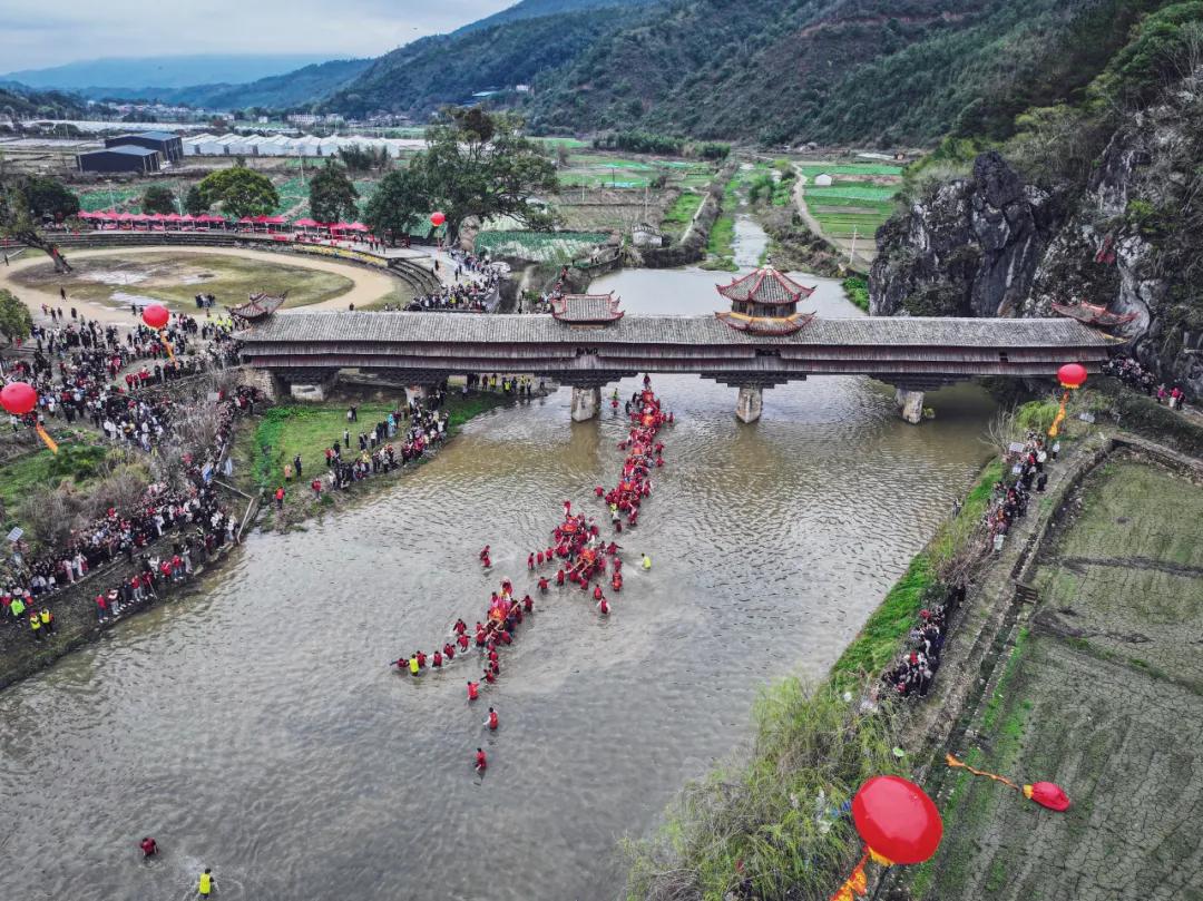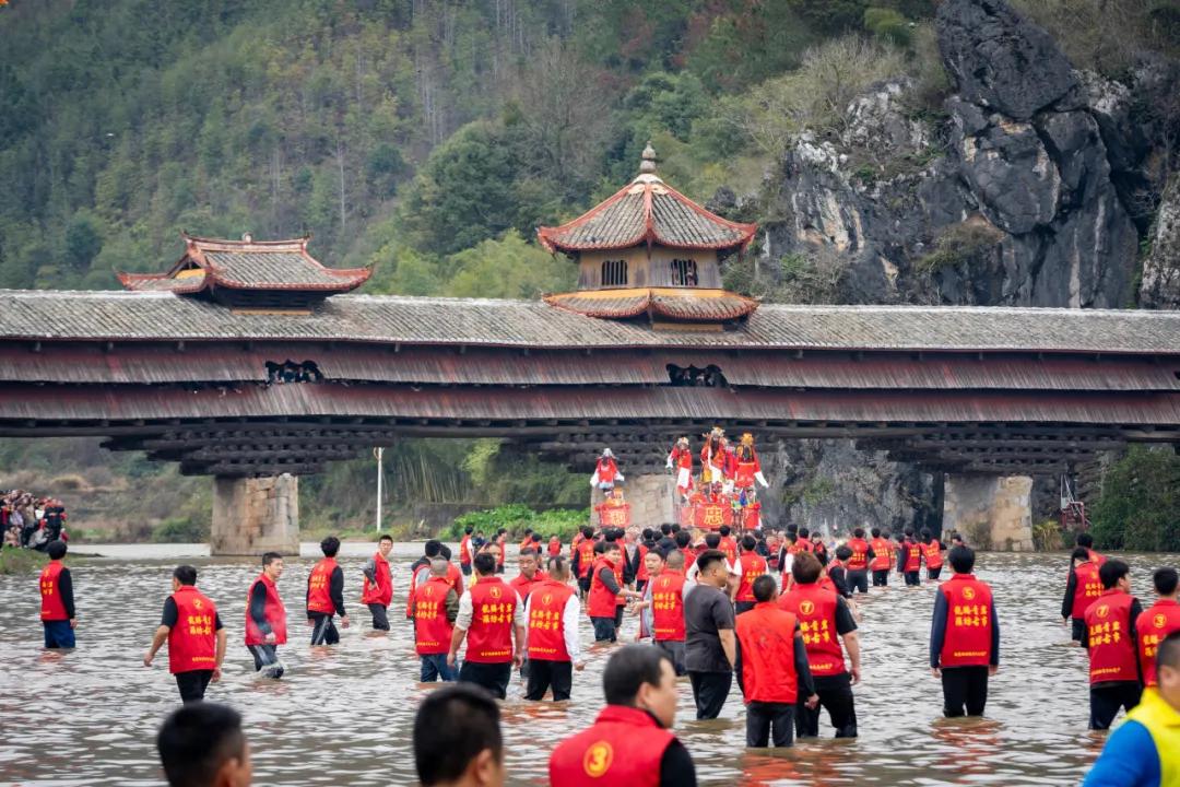 正午时分,三声神铳巨响划破长空,最震撼的逆水狂奔环节正式登场。云龙桥下的青岩河畔,抬轿汉子们相互泼水热身,水花飞溅间,士气愈发高昂。随后,七棚古事依次冲入冰冷的河水,抬夫们脚踏滑腻河石,迎着湍急逆流踏浪飞奔,寒水浸衣、石滑难行,有人跌倒便立刻起身,同伴伸手相扶,丝毫不停歇前行的脚步。浪花拍打着轿台,呐喊声响彻山谷,这一幕,将客家人奋勇拼搏、力争上游的精神展现得淋漓尽致。