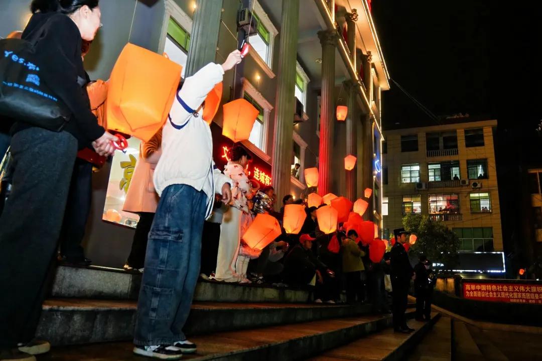 大院内外人头攒动,成千上万的群众、游客围站四周,惊叹声、喝彩声此起彼伏,不绝于耳。“龙来了!快拍!”“一眼望不到头,太壮观了!”孩子们骑在父辈肩头,小手挥舞着欢呼雀跃,眼中满是新奇与欢喜;大人们踮脚远眺,手机、相机齐齐高举,争分夺秒记录下这震撼人心的瞬间。龙身起伏摇曳,烛火点点生辉,光影流转间,映照出一张张洋溢着喜悦与期盼的脸庞。恰在此时,数百盏电子孔明灯同步升空,点点微光汇聚成星河,与大院中盘旋的巨龙相映成趣,将古镇的夜空装点得如梦似幻,浪漫至极。