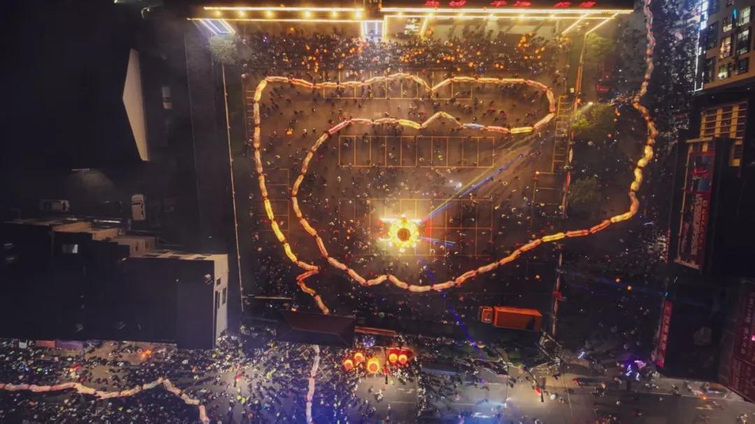 当巨龙行至镇政府大院,这场巡游迎来了最惊艳的时刻。千米长龙在大院中缓缓盘旋缠绕,首尾相应、环环相扣,先是绕着大院广场划出巨大的龙形弧线,而后层层叠绕盘旋,宛若一条蛰伏的巨龙在此蓄力腾跃,龙身的烛火连成一片金色光带,在夜色中熠熠生辉,气势磅礴到令人屏息。