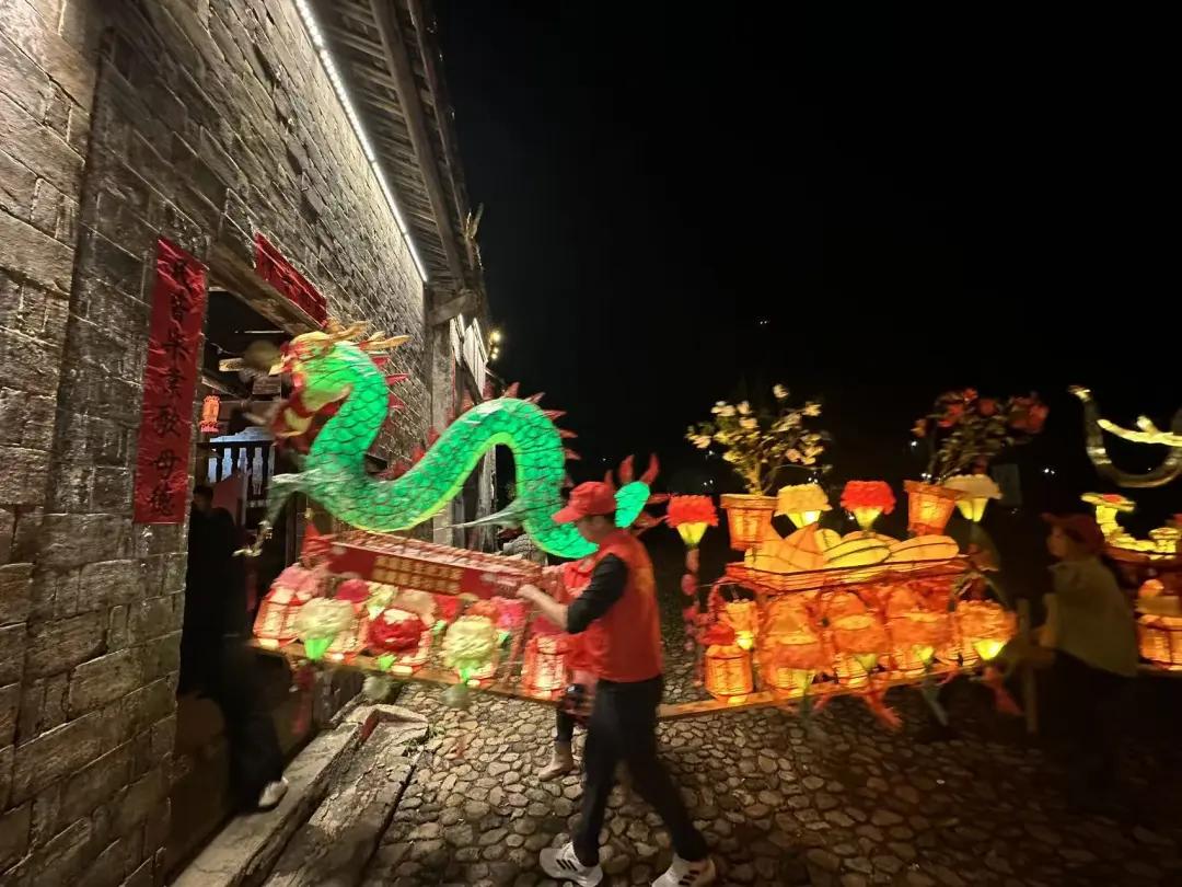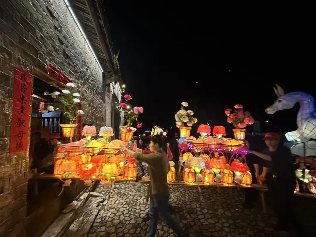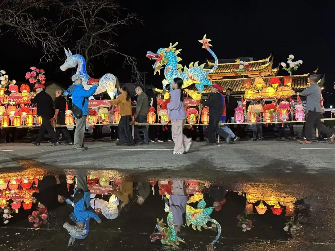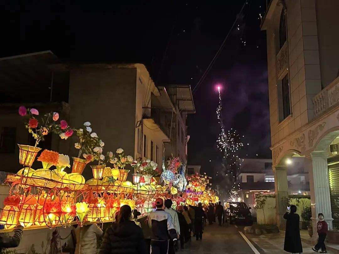 夜幕降临,华灯初上。文昌阁前,天后宫旁,一盏盏巧夺天工的璧洲花灯次第点亮。村民们抬着精心扎制的灯盏,浩浩荡荡穿行于古街深巷、田间阡陌。灯火所至,锣鼓喧天,鞭炮齐鸣,将宁静的古村装点成流动的画卷。永隆桥倒映在水中,与游走的灯火交相辉映,勾勒出一幅独具客家韵味的山水长卷。