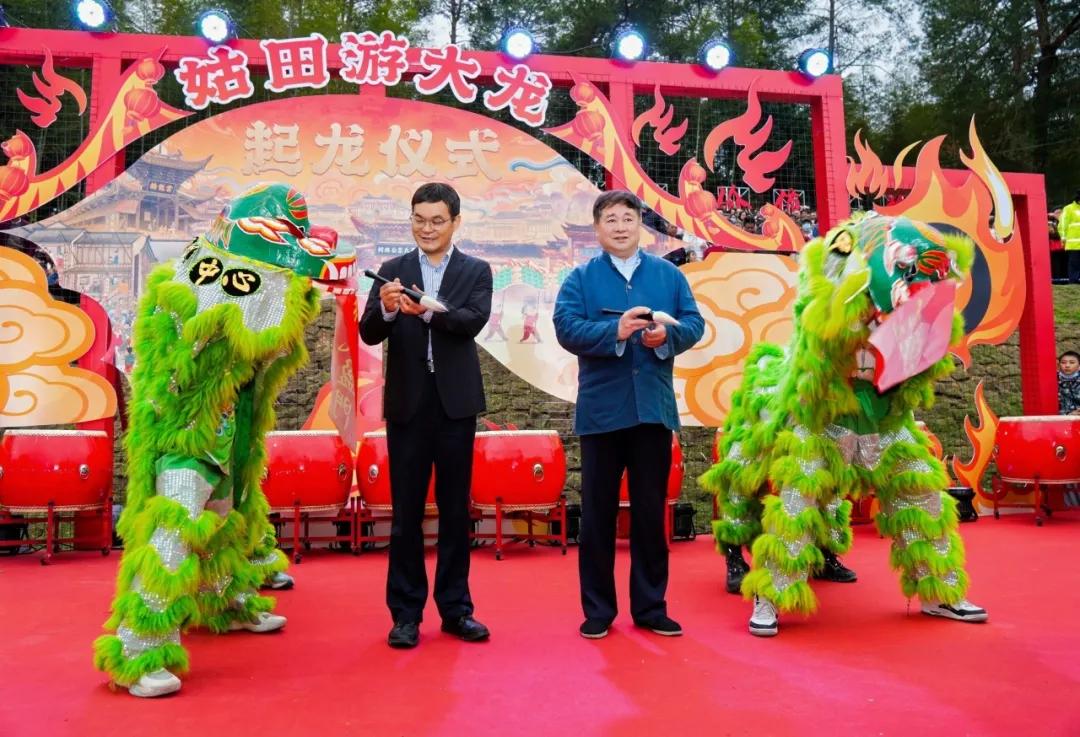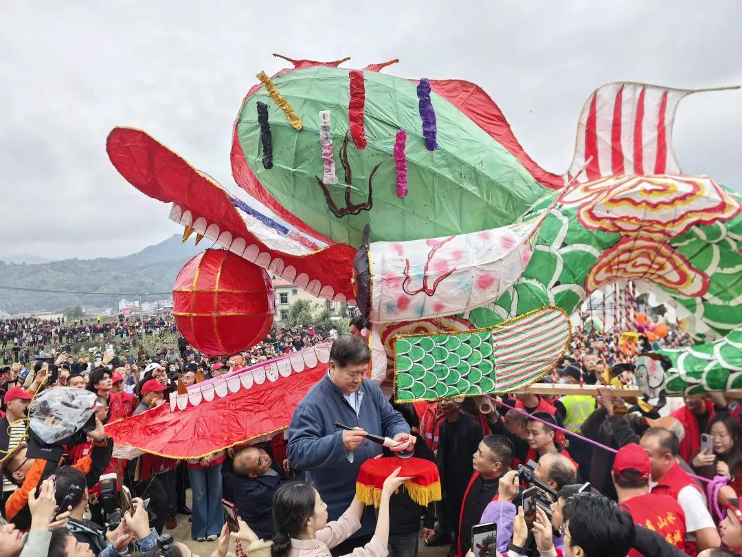 下午,姑田镇起龙广场人头攒动,单霁翔亲临姑田游大龙现场,在数千名观众的欢呼声中,手挥饱蘸朱砂的毛笔为千米大龙点睛,见证这条“天下第一龙”的觉醒时刻。夜幕降临,他留在现场观看大龙夜间巡游,看着千米长龙在火光中蜿蜒穿梭、宛若星河落地,在乡间的开阔天地间,真切感受着姑田大龙的壮美与精巧,触摸到民间民俗最质朴的烟火气。