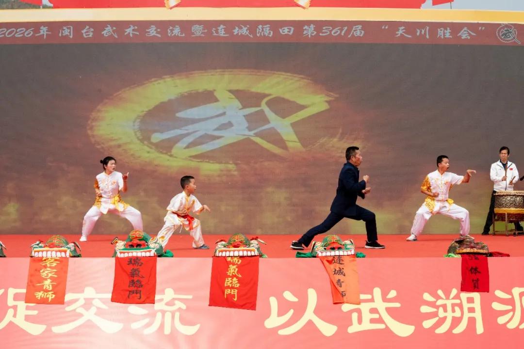 3月8日(农历正月二十),连城县2026年闽台武术交流活动暨隔田村第361届“天川胜会”非遗民俗文化活动在冠豸山站前广场举行。活动以“武承古韵连两岸,情聚同心续锦程”为主题,来自福建、江西、广东、台湾等地以及新加坡武术爱好者跨越山海,齐聚一堂,以武会友、共续文脉。