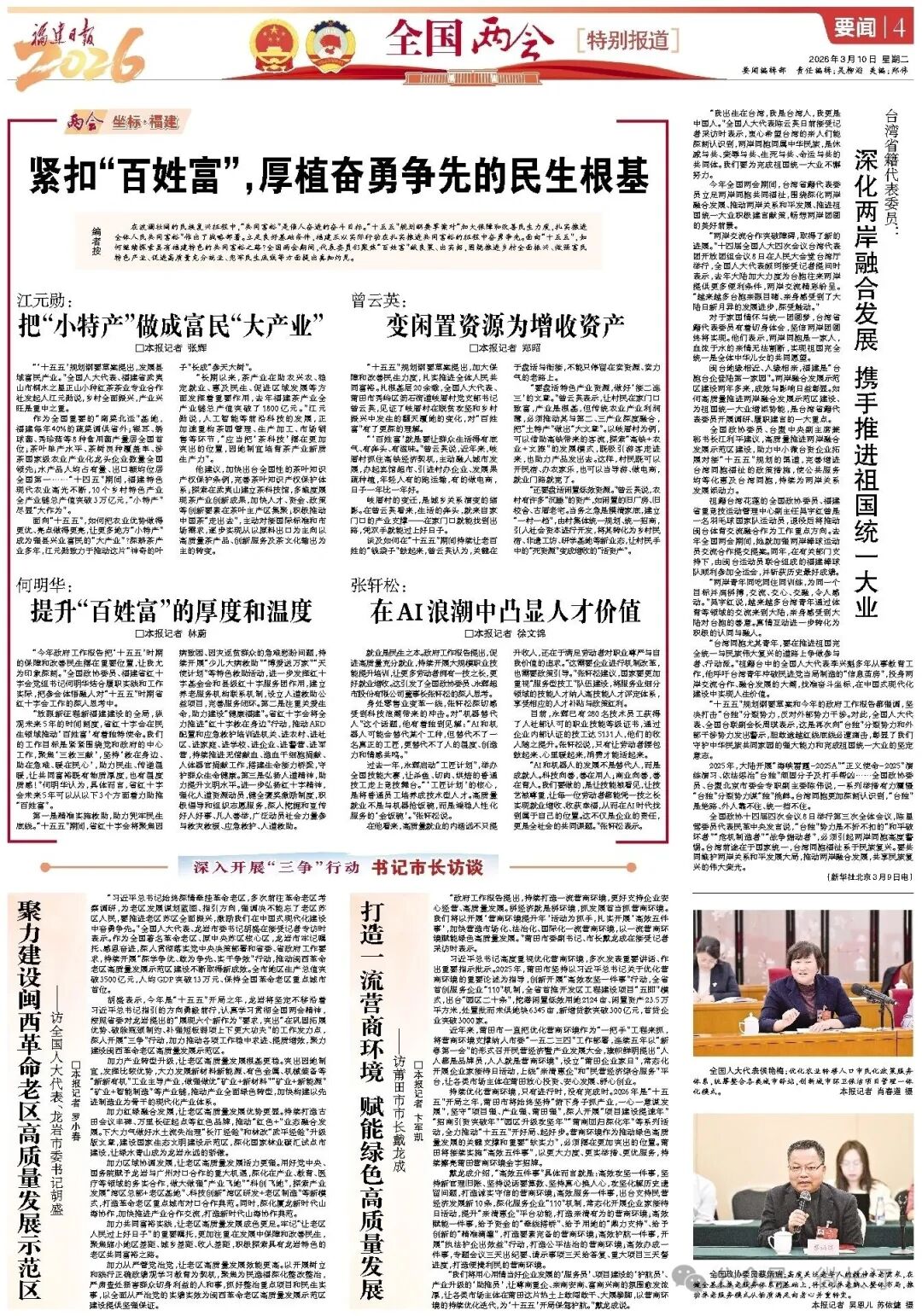 胡盛表示,今年是“十五五”开局之年,龙岩将坚定不移沿着习近平总书记指引的方向勇毅前行,认真学习贯彻全国两会精神,按照省委对龙岩提出的“展现六个新作为”要求,突出“在巩固拓展优势、破除瓶颈制约、补强短板弱项上下更大功夫”的工作发力点,深入开展“三争”行动,加力推动各项工作稳中求进、提质增效,聚力建设闽西革命老区高质量发展示范区。